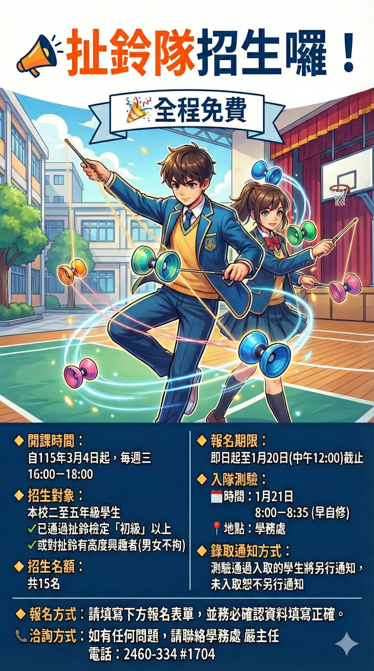 📞 洽詢方式 如有任何問題,請聯絡 學務處 嚴主任 電話: 2460-334 #1704