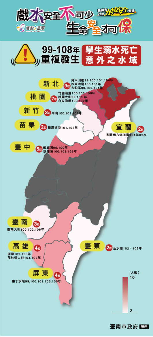 四、為能讓學生方便記誦,教育部體育署提出「救溺五步、防溺十招」及本市溺水熱點圖,務必加強利用各種管道向學生說明宣導(如附件)。