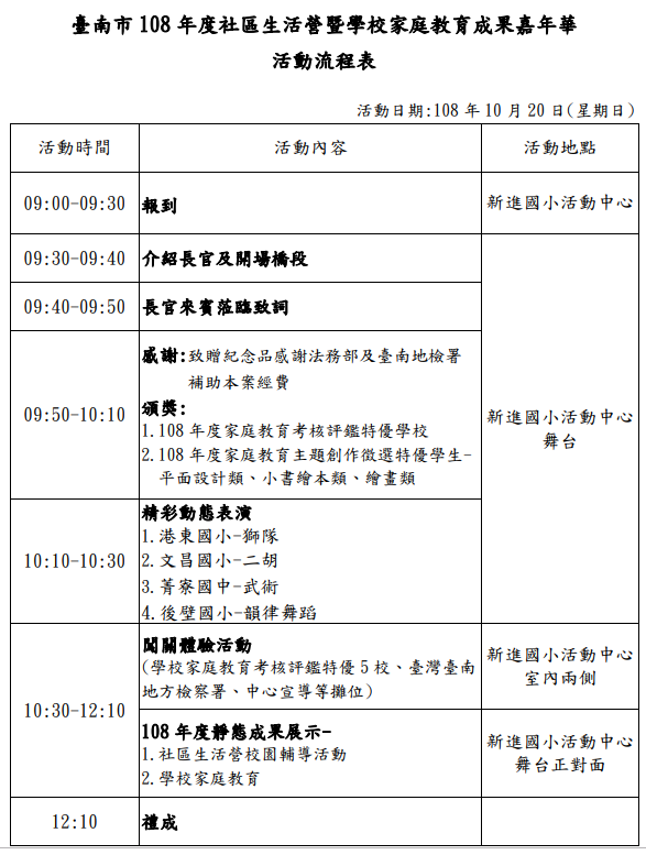 家庭教育中心謹訂 時間: 108 年 10 月 20 日(星期日)上午 9 時 30 分至 12 時 10 分 地點:新營區新進國小活動中心