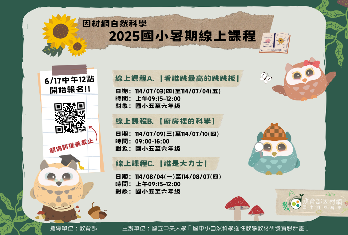 標題:轉知國立中央大學辦理「因材網自然科學 2025 國中小暑期線上課程」 活動簡章及文宣海報,請查照。