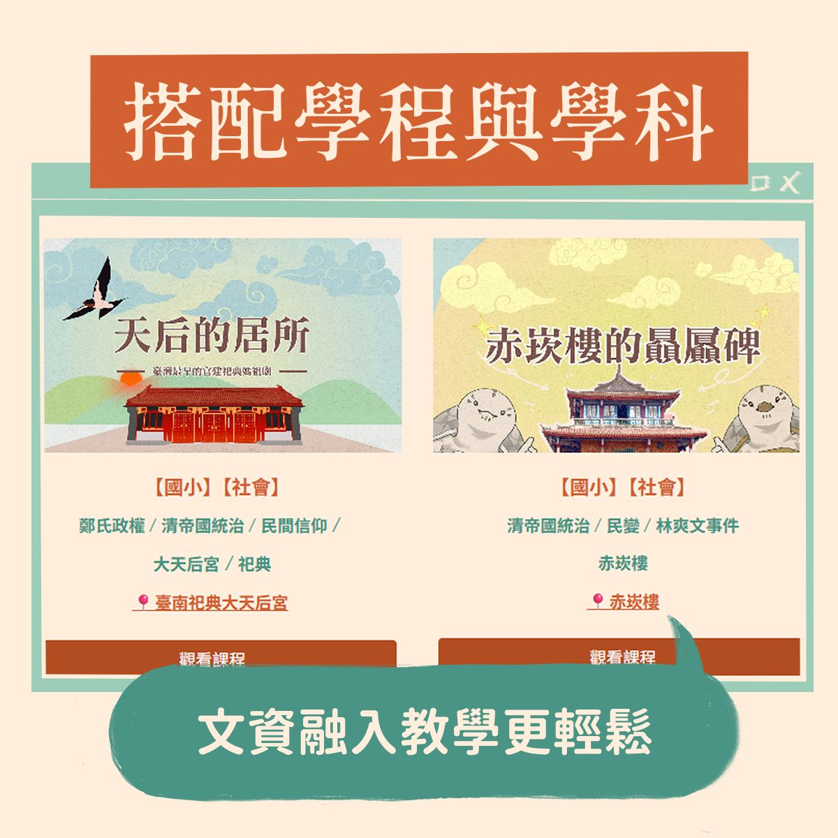 一、旨揭平台係整合本處所設計開發之文化資產相關推廣教育資源與活動資訊,以利師生、一般大眾便於查找資源。文化資產價值之所在,不僅是文化資產場域本身,更可作為讓學生認識的核心素養,因此從文化資產場域內學習的不是認識建築物件而已,更希望藉本平台讓學生可以去探索在場域之中任何可跟學習課程單元連結的各種學習知識;惠請貴校協助公告週知,並歡迎師生多加運用,至紉公誼。