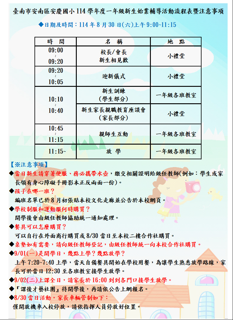 臺南市安慶國小 114 學年度一年級新生始業輔導活動流程表暨注意事項,詳如附件。