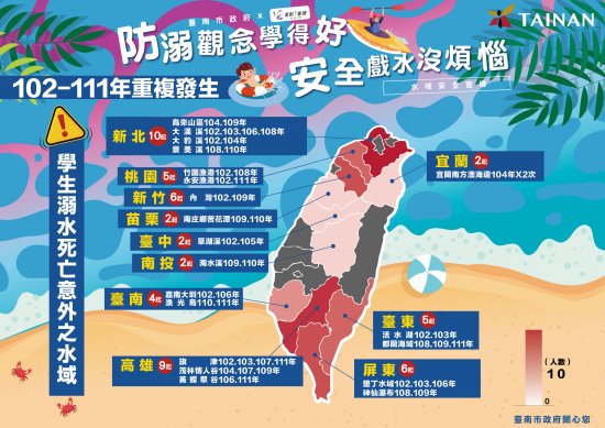 五、進入夏日溺水高峰期,請民眾務必提高水域防護的概念,熟記「救溺5步—叫、叫、伸、拋、划」及遵守「防溺10招」,同時提醒學生及家長一定要選擇合格且有安全防護設施及配置救生員的水域從事活動。
