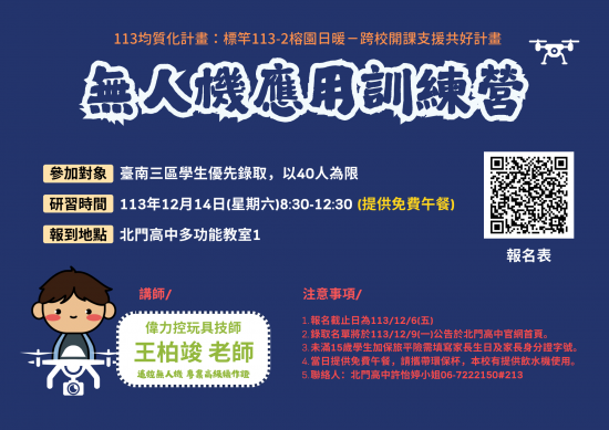 (一)報名截止日為 113/12/6(五),錄取名單將於 113/12/9(一)公告於北門高中官網首頁。