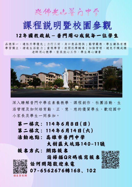 一、本校為一所住宿型學校,為提供國三畢業生及家長認識普門中學學習及住宿環境、課程與活動,讓即將就讀高中高職的孩子及家長能有更多的選擇,特別規劃招生活動--校園參觀暨課程說明會,歡迎國三畢業生的家長及學生參加。