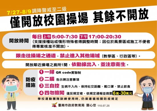 雖然中央流行疫情指揮中心規定 7/27-8/9 調降警戒至 2 級,但中小學仍然只於規定時間(每天 05:00-07:30 ; 17:00-20:30)開放學校操場供民眾使用,並未開放其他空間及場館。請各位民眾遵守相關規定,避免觸法。