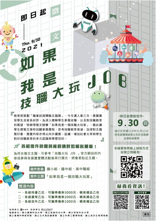 四、為能深入瞭解學生參觀展覽或體驗課程後的收穫,舉辦「如果我是一個技職大玩家」徵文競賽,有意願參加者請於110年9月30日前投稿至Google表單者(https://reurl.cc/ZGErYW ),將有機會獲得1000元至3000元不等的禮券及精美禮品1份。競賽報名詳情,請參閱「技職大玩JOB」網站或「技職動起來」臉書粉絲頁。