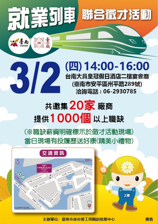 轉知臺南市政府勞工局職訓就服中心,將於112年3月2日(週四)下午2時假安平區台南大員皇冠假日酒店二樓宴會廳(安平區州平路289號)辦理「就業列車聯合徵才活動」,請查照。