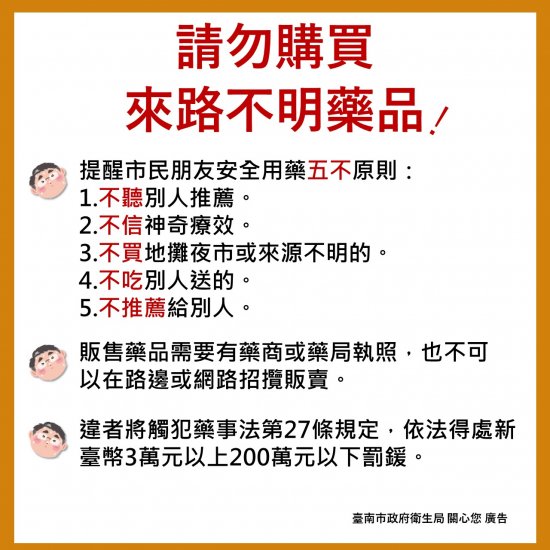 二、為強化民眾用藥安全,杜絕來路不明的藥品,請協助廣為刊登宣導,參考文字稿:「切勿購買來路不明、宣稱效能誇大的藥品或食品,遵循用藥『五不』原則:1.「不聽」別人推薦。2.「不信」神奇療效。3.「不買」網路、地攤夜市或來源不明的藥。4.「不吃」別人送的。5.「不推