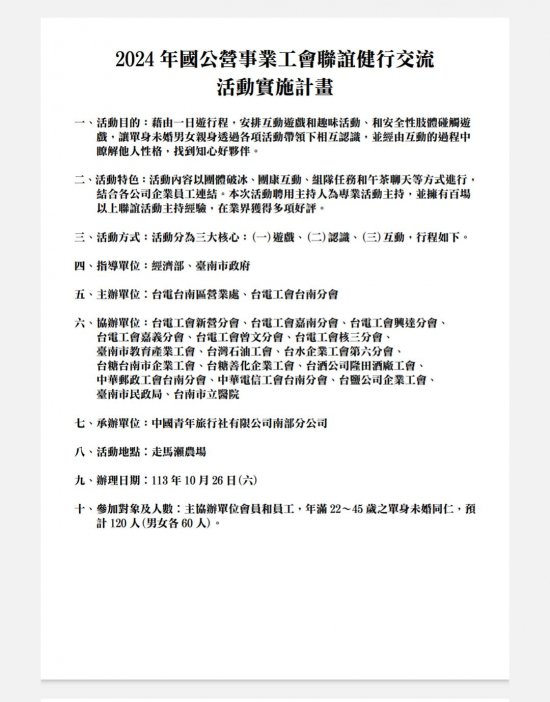 轉知有關113年大台南國公營事業公務聯誼交流及健行活動業於9月1日開放填單報名,女性尚有名額,請同仁踴躍報名參加。