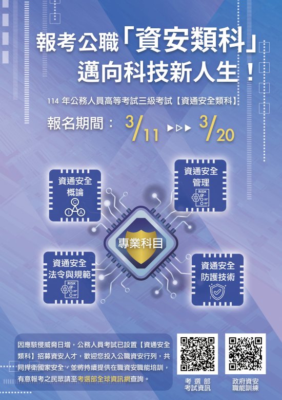 一、依據數位發展部資通安全署 114 年 1 月 16 日資安輔導字第 1143000009 號函辦理。 二、檢附數位發展部資通安全署原函及原函附件(宣導文字訊息 1 份、宣導海報電子檔 2 份。)