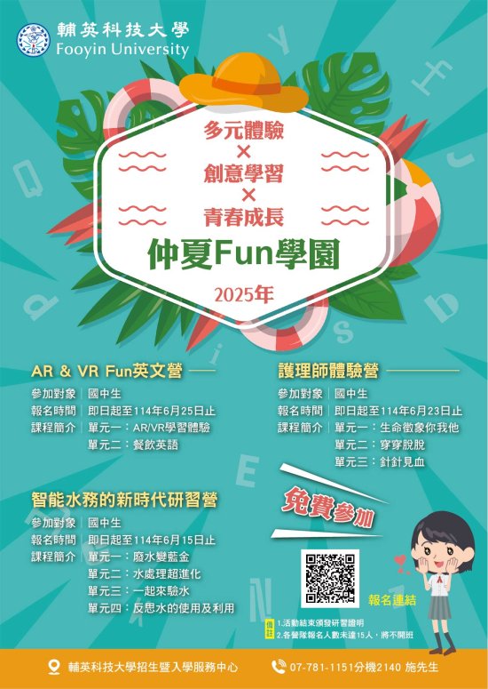 轉知輔英科技大學『輔英科大2025仲夏Fun學園:多元體驗 × 創意學 習 × 青春成長營』活動訊息