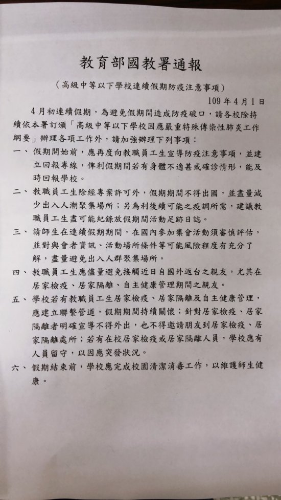 二、109 年 4 月 1 日教育部國民及學前教育署「高級中等以下學校連續假期防疫注意事項」通報 1 份(如附件)。