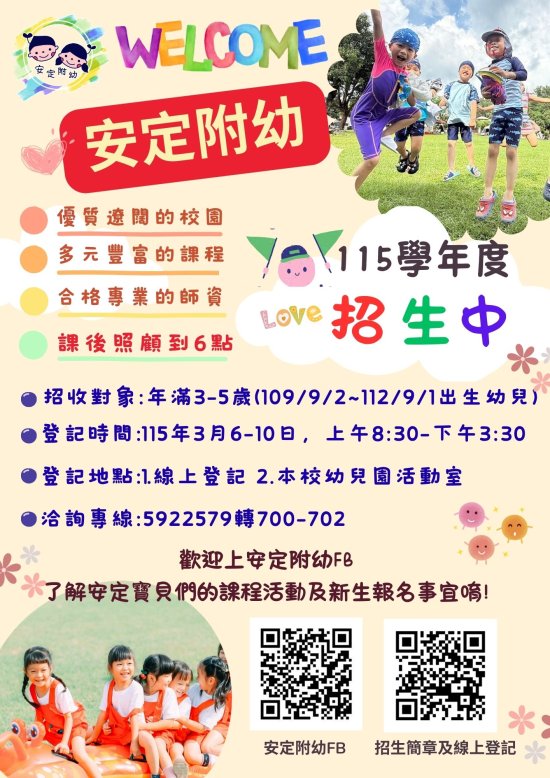 安定國小附設幼兒園 115 學年度招生囉~歡迎加入安定附幼的大家庭~