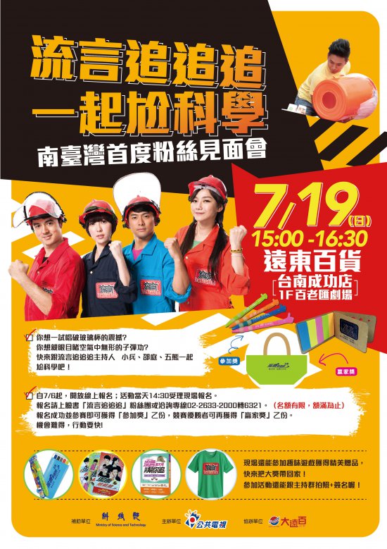 二、第一場為『流言追追追 一起尬科學』首度南台灣粉絲見面會,於中華民國104年7月19日下午三點至四點半於遠東百貨台南成功店1F百老匯劇場舉行,主持人小兵、邵庭、班傑、五熊將出席與民眾互動玩科學遊戲。自7月6日起開放線上報名,詳情請上「流言追追追」官方臉書。