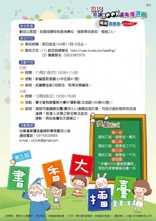 三、活動聯絡人:臺南市立圖書館推廣組吳靜宜小姐 (06)2255146分機125。