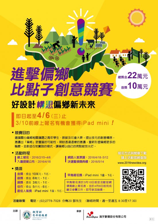 三、隨函檢送活動簡章(附件1)及EDM(附件2)。「進擊偏鄉比點子創意競賽」」徵件時間為:本(105)年2月15日至4月6日,參加資格不限,參加者須於期限內上傳提案至活動官網,本年4月18日公布入圍提案、4月18至5月12日進行網路票選、5月14日辦理決選暨頒獎典禮。詳情請見活動官網(www.2016newidea.org)或洽本案承辦單位鴻宇數碼股份有限公司,電話:02-2778-7028分機20鄧先生。