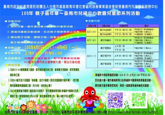 (一)活動名稱:105年親子嘉年華~臺南市兒福中心歡慶兒童節系列活動