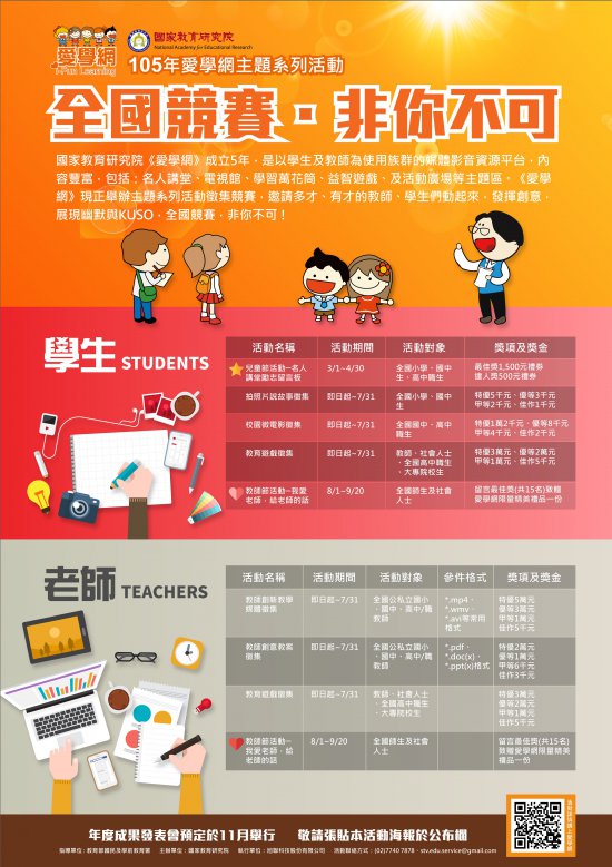 二、愛學網係國內專為廣大學子及教師設置之學習及教學輔助平臺,包含各式各樣學習資源與資訊;本年度持續辦理「愛學網系列活動」,鼓勵全國教師及學子展現長才,發揮創意創作各式精采作品。
