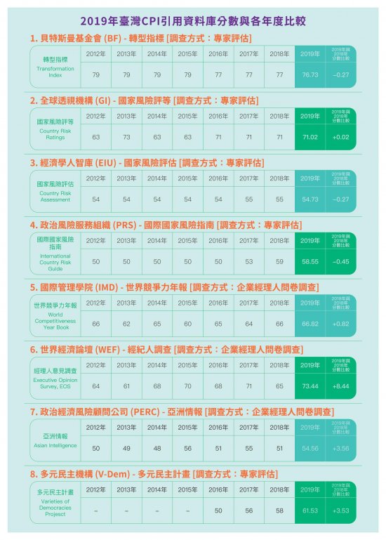 國際透明組織公布2019年「清廉印象指數(CPI)」,在180個受評國家中,台灣排名第28名,分數為65分,超過全球84%受評國家,為2012年新評比標準以來最佳成績。
