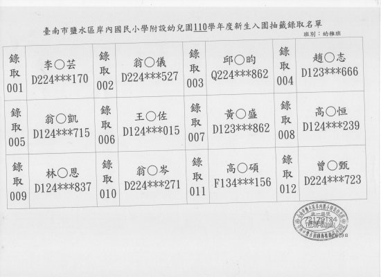 岸內附幼110年學年新生入園招生錄取名單如附件,本次招生報名的12位幼兒皆全數錄取,請記得拿報名收執聯來報到,請務必最晚在4/30(五)中午12時前來幼兒園教室完成報到唷!