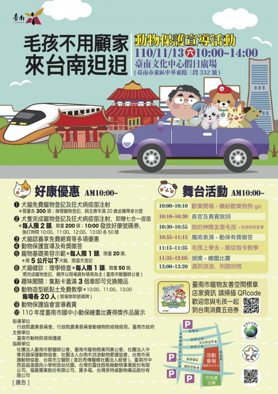 11月13日10時,臺南市文化中心假日廣場動保宣導活動,提供限量免費寵物登記、狂犬病疫苗、犬用七合一疫苗(每人限兩頭,現場發放好康券)、犬貓健診及魔術表演等,臺南市動保處邀請您!