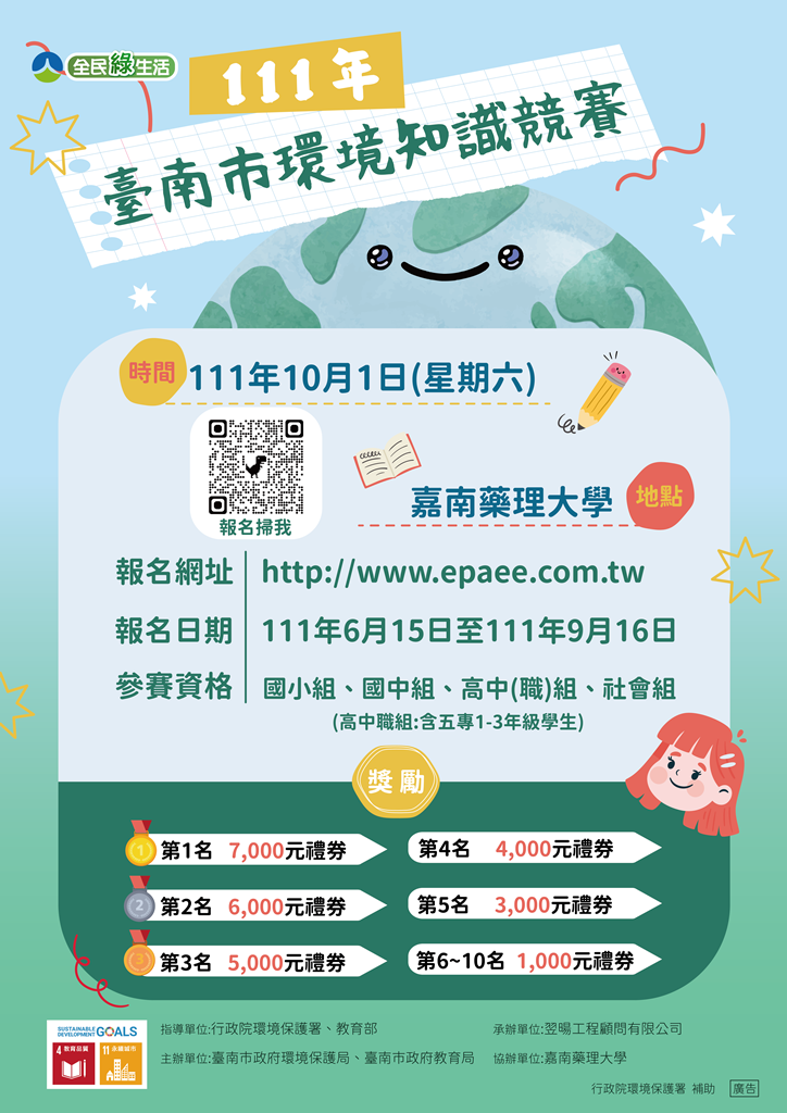 4、為獎勵指導老師輔導學生於賽前充實環保知識,凡榮獲本市競賽高中職以下組別前6名之本府所屬學校指導教師給予嘉獎,第1~3名給予嘉獎2次,第4~6名給予嘉獎1次,請選手報名時務必填入指導老師資料以利敘獎作業。