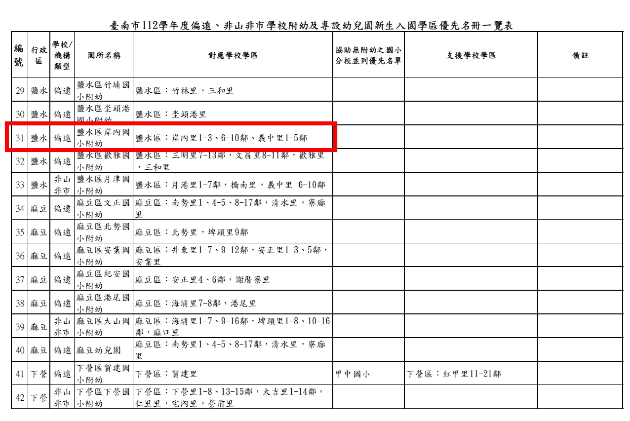 臺南市鹽水區岸內國民小學附設幼兒園112學年度招生簡章 檔案如附檔