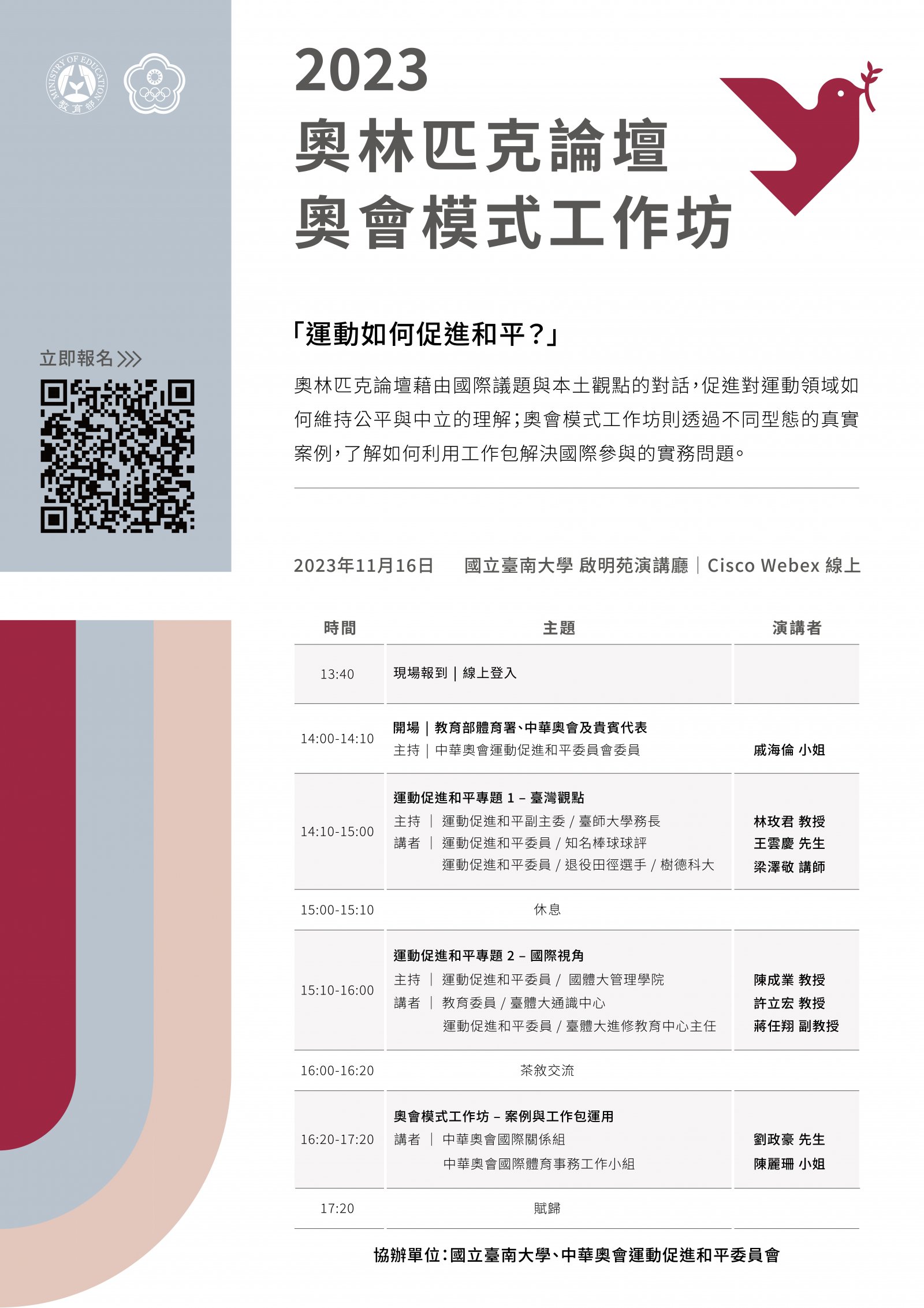 五、旨揭活動訂於112年11月16日(星期四)下午2時至5時20分假國立台南大學啟明苑演講廳(臺南市中西區樹林街二段33號)舉行,採實體與線上混成進行(現場名額有限,超額改為線上參與),活動提供結業證書供學習時數認證,報名連結:https://forms.gle/VpM2XnSVNh1nSuYR7。