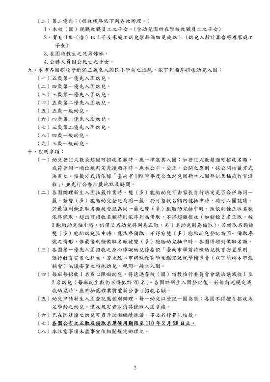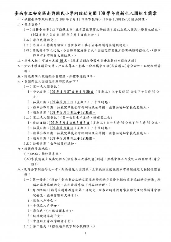 臺南市 109 學年度安定區南興國小附設幼兒園新生招生簡章如附件,請參閱。