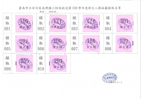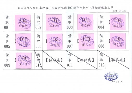 以下公告正取生名單及備取生名單,請正取生今日 5/1(五)12 點前拿著登記收執聯找幼兒園李老師報到,備取生資格保留到明年2月28日.