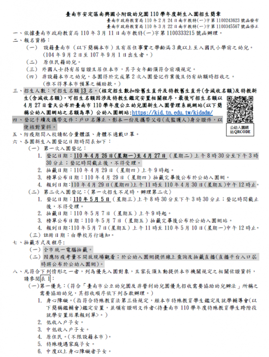 臺南市 110 學年度安定區南興國小附設幼兒園新生招生簡章如附件,請參閱。
