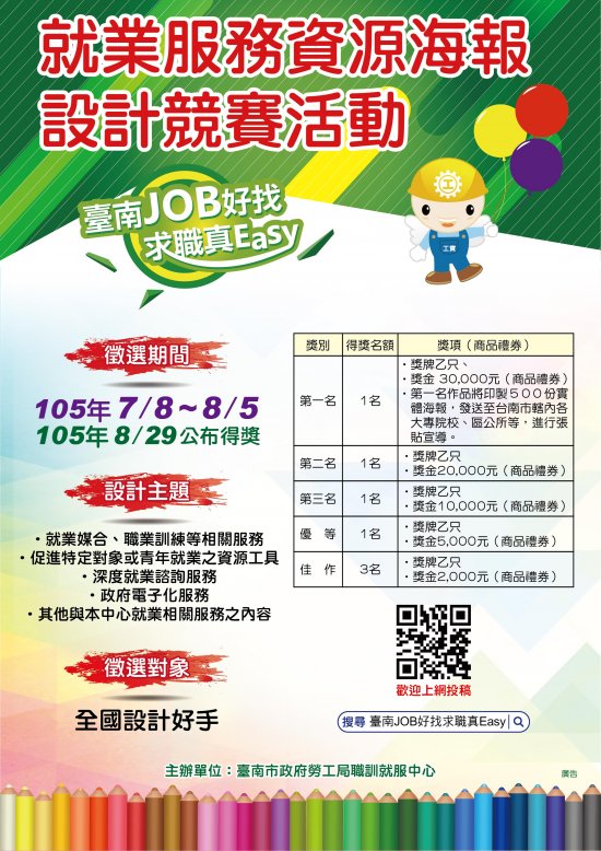 大募集!!台南市政府勞工局向全國設計好手徵選就業服務資源海報設計,最高獎金 3 萬元!請以就業服務及職業訓練等本中心相關服務資源為題設計海報,於 7/8~8/5 期間上傳活動網站報名,網址:http://job.tainan.gov.tw/job_poster/或搜尋關鍵字「臺南 JOB 好找」,也可洽詢 06-6330820 。