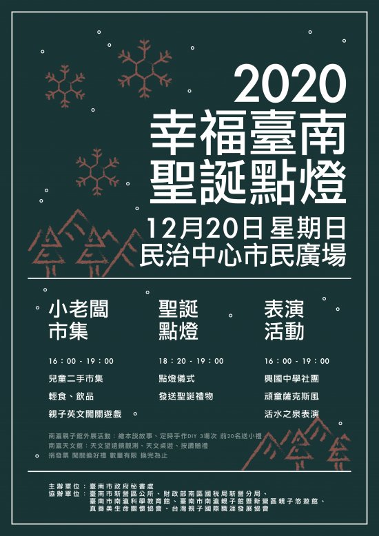 台南市政府訂於109年12月20日在民治市政中心市民廣場舉辦《2020幸福臺南~聖誕點燈》活動,請踴躍參加。