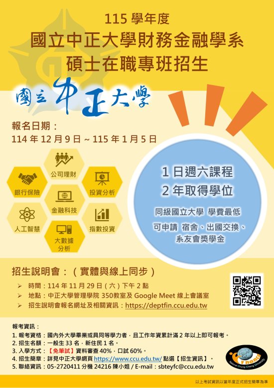 一、中正大學財務金融學系碩士在職專班(以下簡稱本班)擁有多元財金專業課程,包括公司理財、銀行保險、投資分析,以及目前熱門的金融科技、大數據分析、人工智慧、指數投資等課程。週六一天上課,兩年取得碩士學位,非本科系亦可修讀,適合各產業對財務金融有興趣人士在職進修。