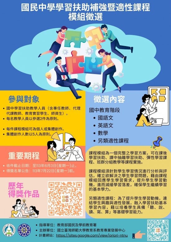 三、國民中學學習扶助補強暨適性課程模組徵選活動,詳細內容請參見附件簡章。