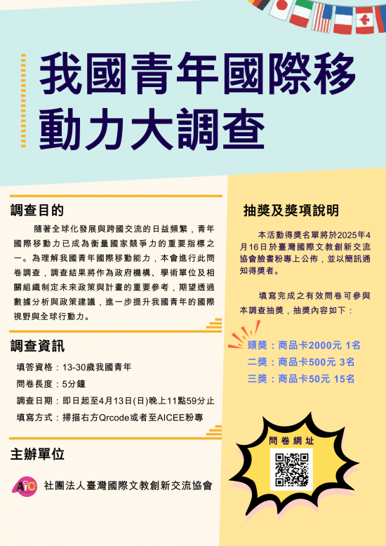 一、隨著全球化發展與跨國交流日益頻繁,青年國際移動能力已成為衡量國家競爭力的重要指標。為理解我國青年國際移動能力,本會進行此調查,調查結果將作為政府機構、學術單位及相關組織制定未來政策與計畫的重要參考。