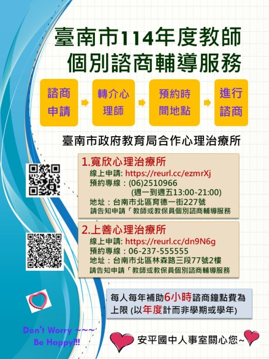 (2)上善心理治療所-線上申請:https://reurl.cc/dn9N6g 預約專線 06-237-555555告知申請教師個別諮商輔導服務