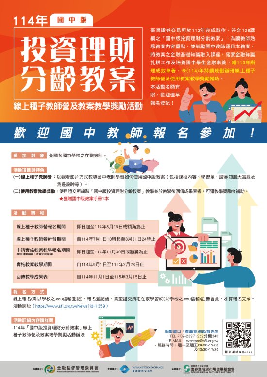 四、本基金會已建置「國中版投資理財分齡教案」網站專區,供全國各國中學校之在職教師查詢相關訊息,網址為 https://www.sfi.org.tw/News?id=1359 。隨函檢附線上種子教師營及教案教學獎勵活動辦法與 EDM 各一份,敬請惠予協助宣傳,並鼓勵教師報名參加。