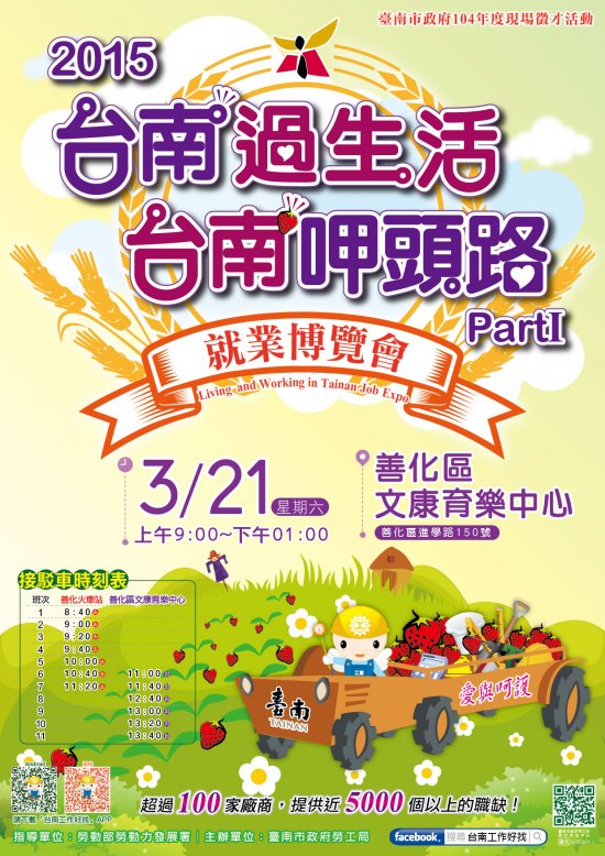 臺南市政府將在 3 月 21 日(星期六)上午 9 點至下午 1 點,假善化區文康育樂中心舉辦 2015「台