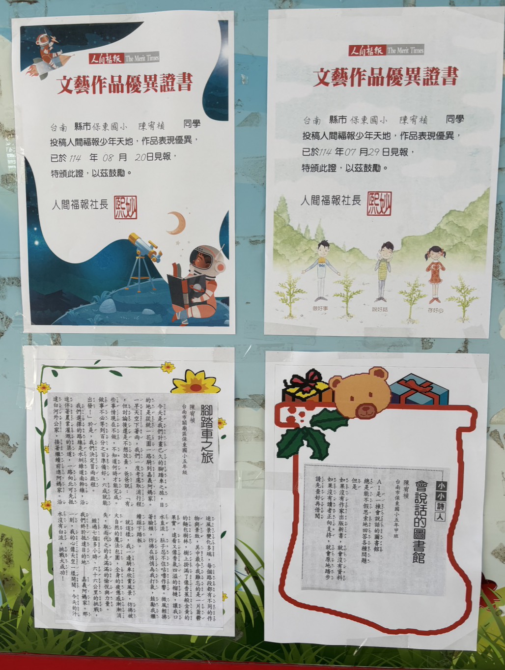 ◎妙筆生花~恭喜六甲陳宥禎同學投稿人間福報少年天地,兩則文章優異獲刊登見報,另外得獎作品張貼在學校中廊公布欄中 請前往欣賞