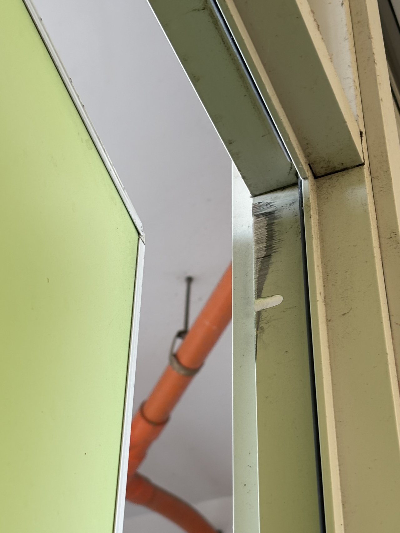 903 靠近洗手台的門傾斜,磨到門框,所以風吹或關門時都會很大聲。 看起來是門軸沒鎖緊或歪掉了! |