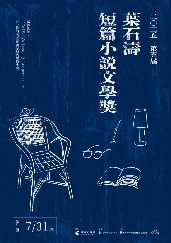 發文日期:中華民國 114 年 5 月 8 日 發文字號:南市文研字第 1140689676 號 速別:普通件 密等及解密條件或保密期限: 附件:徵文海報及活動簡章(0689676A00_ATTCH1.pdf 、 0689676A00_ATTCH2.pdf 、 0689676A00_ATTCH4.jpg 、 0689676A00_ATTCH5.jpg) 主旨:本局辦理「第十五屆臺南文學獎」及「第五屆葉石濤短篇 小說文學獎」徵文活動,請惠予協助公告宣傳,並鼓勵所 屬同仁、師生踴躍參加,請查照。 說明: 一、旨揭徵文活動收件日期至 114 年 7 月 31 日截止,採紙本及線 上投稿。 (一)「第十五屆臺南文學獎」報名表請至臺南文學獎徵件官 網 : https://culture.tainan.gov.tw/theme/latestevent/index?Parser =9,41,240 下載或點選。 (二)「第五屆葉石濤短篇小說文學獎」報名表請至葉石濤文 學 紀 念 館 官 網 : https://culture.tainan.gov.tw/theme/latestevent/index?Parser =9,47,302,292 下載或點選。
