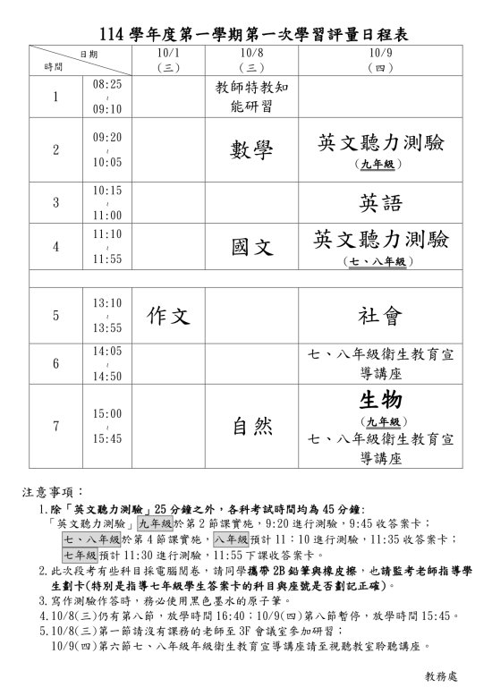 七、八年級於第 4 節課實施,八年級預計 11 : 10 進行測驗, 11:35 收答案卡;