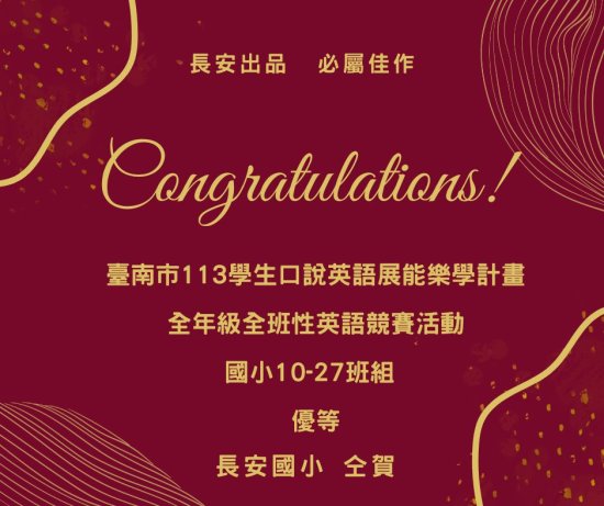 本校英語教師團隊參加臺南市 113 學年度「2030 雙語政策-提升國中小師生口說英語展能樂學計畫-子計畫三:(3-1)辦理全校性或全年級性學生英語多元展能活動計畫」評選,榮獲全年級全班性英語競賽活動(國小 10-27 班組)優等。