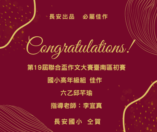本校六年乙班邱芊瑜同學參加「第 19 屆聯合盃全國作文大賽初賽」榮獲國小高年級組佳作,感謝李宜眞老師辛苦指導!!