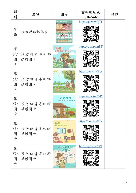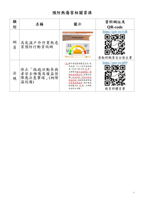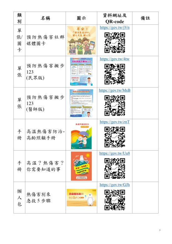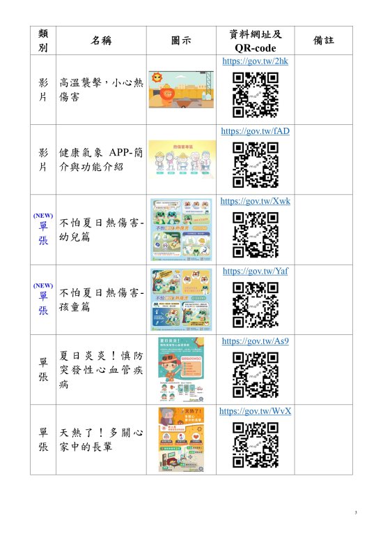 三、請依教職員工生或所屬人員分眾需求,運用該部製作之影片、單張、圖卡等素材,以及透過網站、社群媒體或其他管道,宣導個人防護做法與急救步驟;另請鼓勵運用「樂活氣象 APP」掌握預警資訊,並加強脆弱族群(含嬰幼童高齡者、慢性病者、服用藥物者、戶外活動者及過重者)之防範措施,例如:檢查調溫設備(如風扇、冷氣)與環境通風狀況,評估減少、調整或停止戶外課程與活動等。