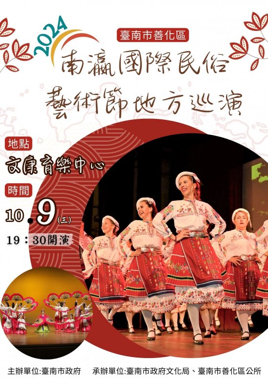 說明:臺南市政府文化局策劃之「2024 南瀛國際民俗藝術節」活動,訂於 113 年 10 月 9 日(星期三)晚上 7 時 30 分於本區文康育樂中心辦理巡演(臺南市善化區進學路 150 號),本校協助宣導推廣,請踴躍參加。