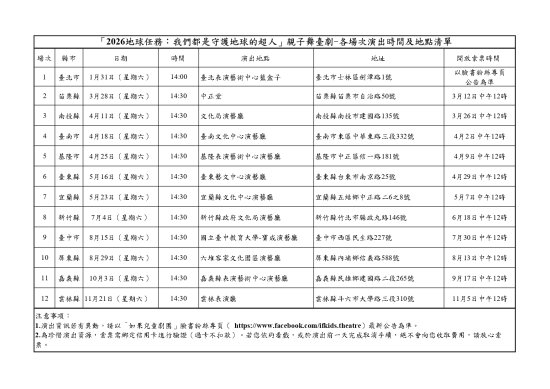 六、檢附「『2026 地球任務:我們都是守護地球的超人』親子舞臺劇-各場次演出時間及地點清單」1 份。