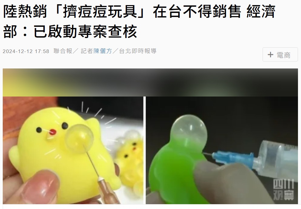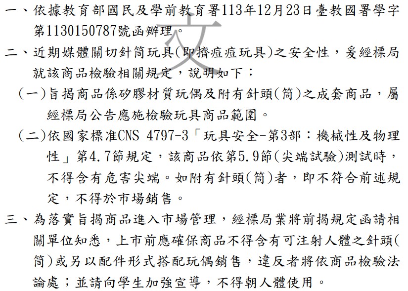 針筒玩具(即擠痘痘玩具)之安全性,經標局就該商品檢驗相關規定,依國家標准CNS 4797-3「玩具安全-第3部:機械性及物理性」第4.7節規定,該商品依第5.9節(尖端試驗)測試時,不得含有危害尖端。如附有針頭(筒)者,即不符合前述規定,不得於市場銷售。
